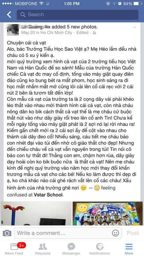 Trước đó, ngày 7/9, dư luận bàn tán xôn xao xung quanh việc cháu Lê Quang Minh Hải (lớp 3, trường VStar, quận 7, TP HCM) bỗng nhiên bị nhà trường buộc thôi học vì mẹ của em nhận xétđồng phục của con xấu, bất tiện.