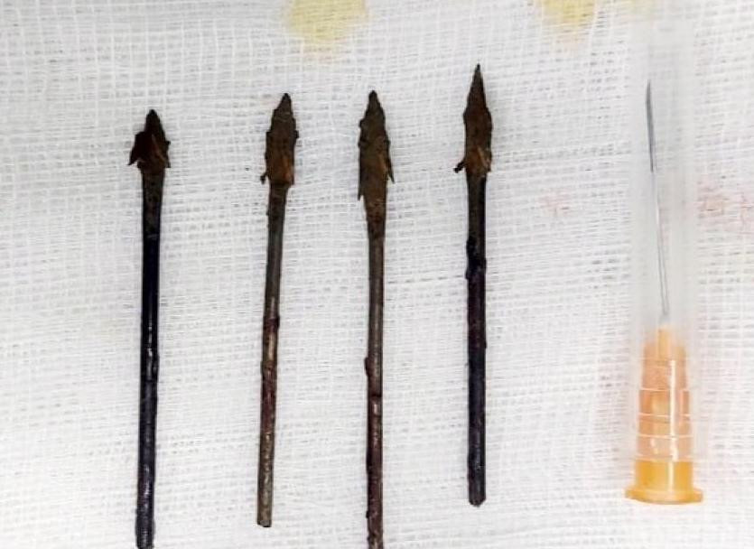 Những mũi tên bằng kim loại được lấy ra khỏi mặt mặt bé trai sau ca phẫu thuật.