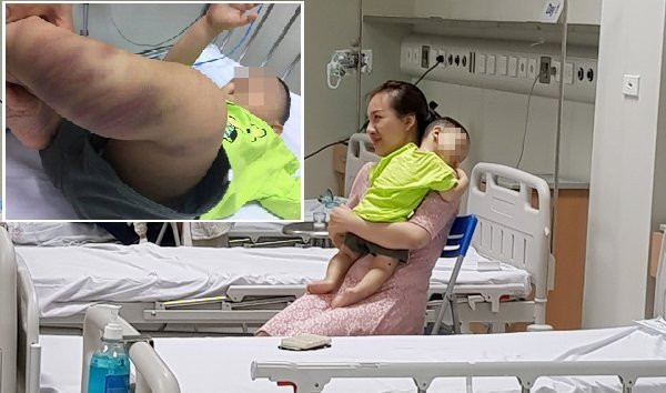 Cháu bé với những vết bầm tím khắp người. (Ảnh: Bệnh viện cung cấp)