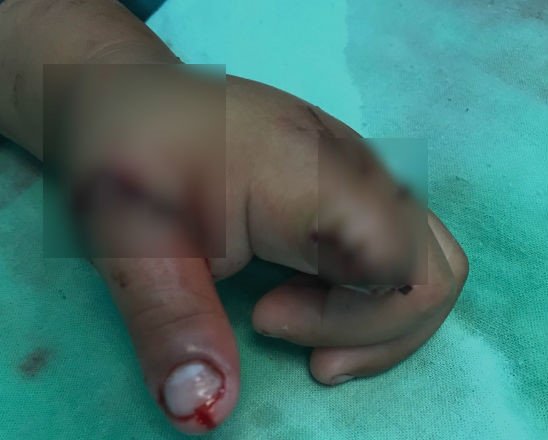 Ngày 8/3, Bệnh viện Chấn thương Chỉnh hình TP. HCM tiếp nhận một bé trai 3 tuổi (quê Long An) nhập viện trong tình trạng đứt lìa ngón tay trỏ và ngón cái. Do ngón trỏ bị dập nát, không còn khả năng phục hồi nên bác sĩ buộc phải tháo khớp ngón tay.