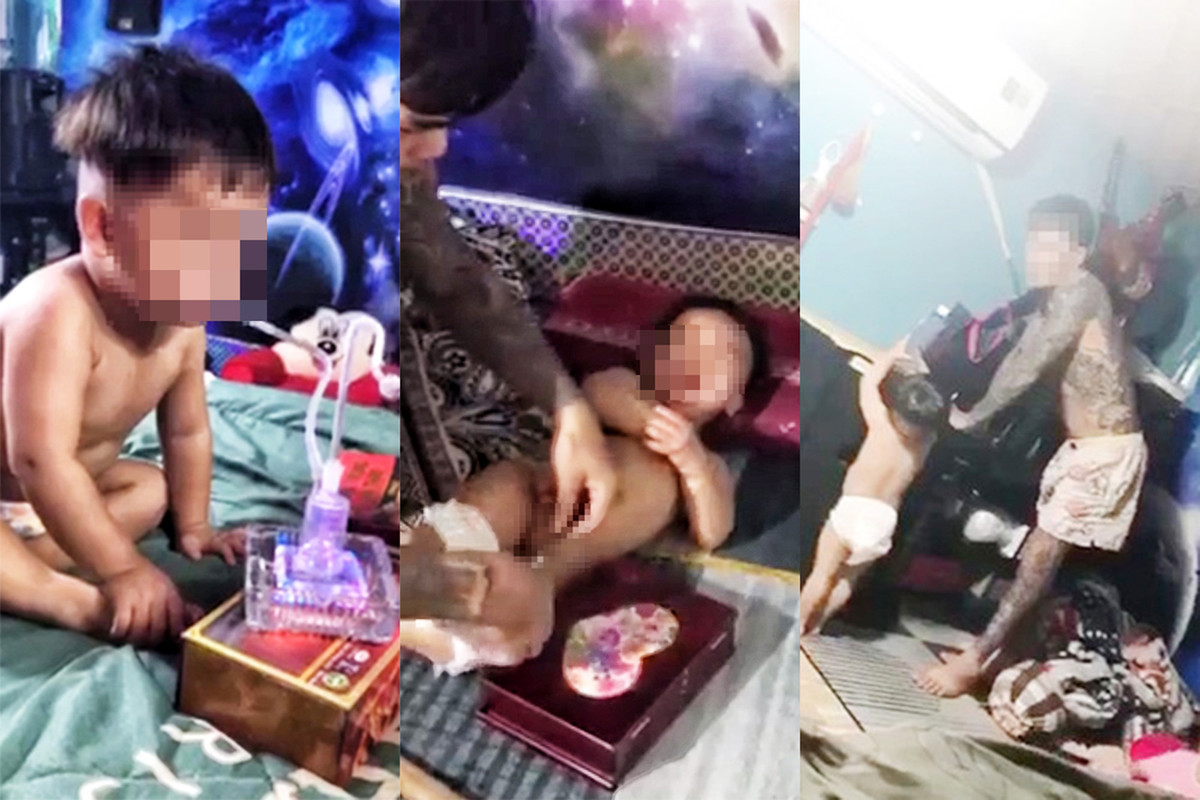 Như VTC News đưa tin, tối 24/3, mạng xã hội lan truyền clip ghi lại cảnh bé trai ở trần, mặc bỉm, bị người đàn ông xăm trổ hành hạ, ép sử dụng chất nghi là ma túy đá.