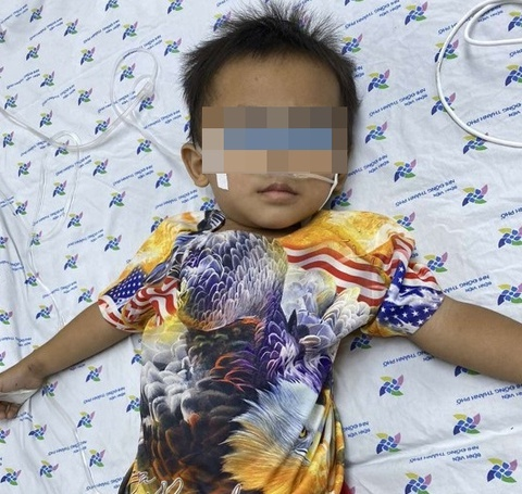 N.H.M. được gia đình đưa đến cấp cứu trong tình trạng li bì, thở mệt, tím tái. Gia đình bé kể, trước nhập viện một giờ, bé thấy chai nước để trên bàn nên mở nắp uống. Không may, đây là chai đựng dung dịch tẩy mực in. Thời điểm nhập viện, bé có biểu hiện suy hô hấp nặng, tím tái, thở co rút lồng ngực. X-quang phổi cho thấy hình ảnh viêm phổi hít bên phải, ngoài ra nhịp tim nhanh.