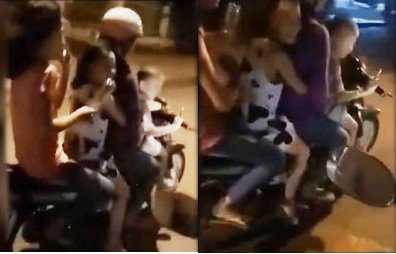 3 người ngồi trên xe gắn máy vô tư cười đùa, cổ vũ trong khi bé trai liên tục vặn tay ga để xe tăng tốc nhanh hơn. Xe chạy nhanh ở làn phải và thỉnh thoảng lấn về phía trái, sát làn ngược chiều.