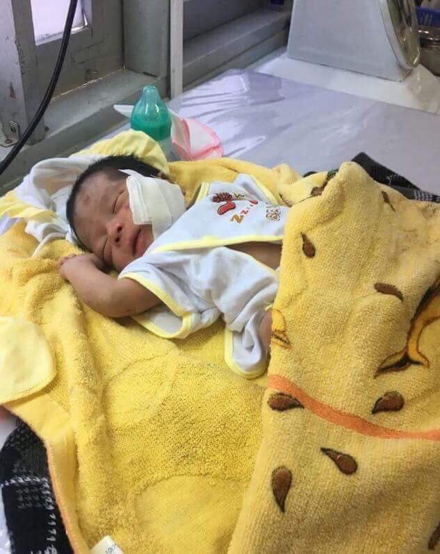 Khi cào hết lớp đất cát, chị Trúc phát hiện bé vẫn còn thở, trên người dính đất cát và vẫn còn nhau thai và dây rốn. Chị Trúc cùng gia đình sơ cứu ban đầu và đưa đến trạm xá, trình báo với công an địa phương. Lúc phát hiện, bé trai sơ sinh này còn có vết thương tại vùng mặt phía bên phải.