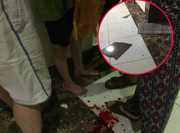 Viên đá ốp bị vỡ đôi rơi trúng đầu cháu bé.