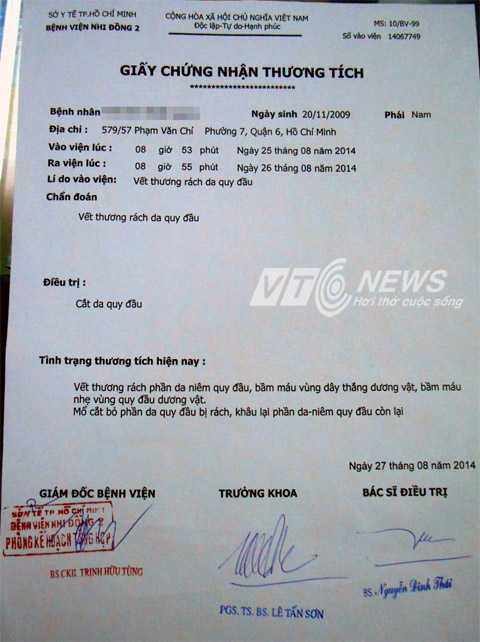 Giấy chứng nhận thương tích bé Q. do Bệnh viện Nhi Đồng 2 có đoạn: “Vết thương rách phần da niêm quy đầu, bầm máu vùng dây thắng dương vật, bầm máu nhẹ vùng quy đầu dương vật. Mổ cắt bỏ phần da quy đầu bị rách, khâu lại phần da-niêm quy đầu còn lại”.