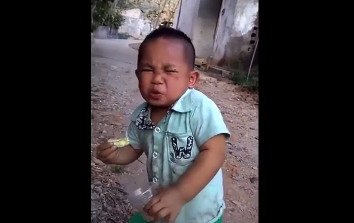 Khuôn mặt nhăn nhó và vẻ co rúm, quằn quại của cậu bé khi ăn miếng xoài chua khiến người xem cũng ê răng theo.