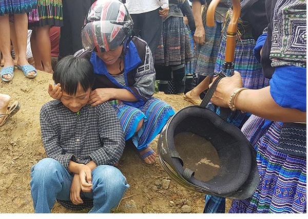 Vội vã cùng mẹ và người thân đến hiện trường nhận thi thể cha, em Giàng A Sơn (con trai anh Hù, đang học lớp 7) khóc òa lên, ngã quỵ xuống đất, liên tục gọi tên cha. Cạnh đó, chị gái của em cũng đứng chết lặng, nấc lên từng hồi.
