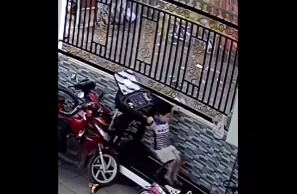 Dùng máy chạy bộ với tốc độ cao nhưng với tư thế xoay ngược người, cậu bé bị trượt theo thanh cuốn không kiểm soát được, phải hét lên nhờ đến cứu viện.