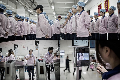 Những người đàn ông và phụ nữ này nhìn chằm chằm vào máy quét khuôn mặt và phù hiệu tại cửa quay an ninh để điểm danh. Việc kiểm tra ID nghiêm ngặt này là để đảm bảo nhân viên không làm thêm quá giờ.