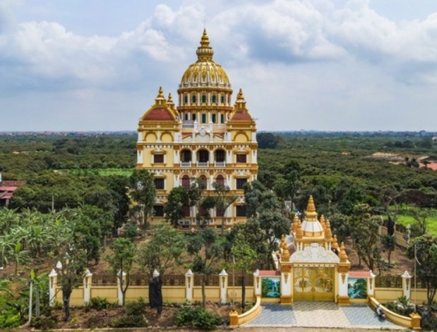Toà lâu đài nổi bật bên con đường đê dài của xã Đông Kết.