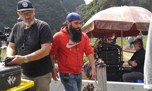 | Đạo diễn Jordan Vogt-Roberts (áo đỏ) trên trường quay "Kong: Skull Island" hôm 27/2. |