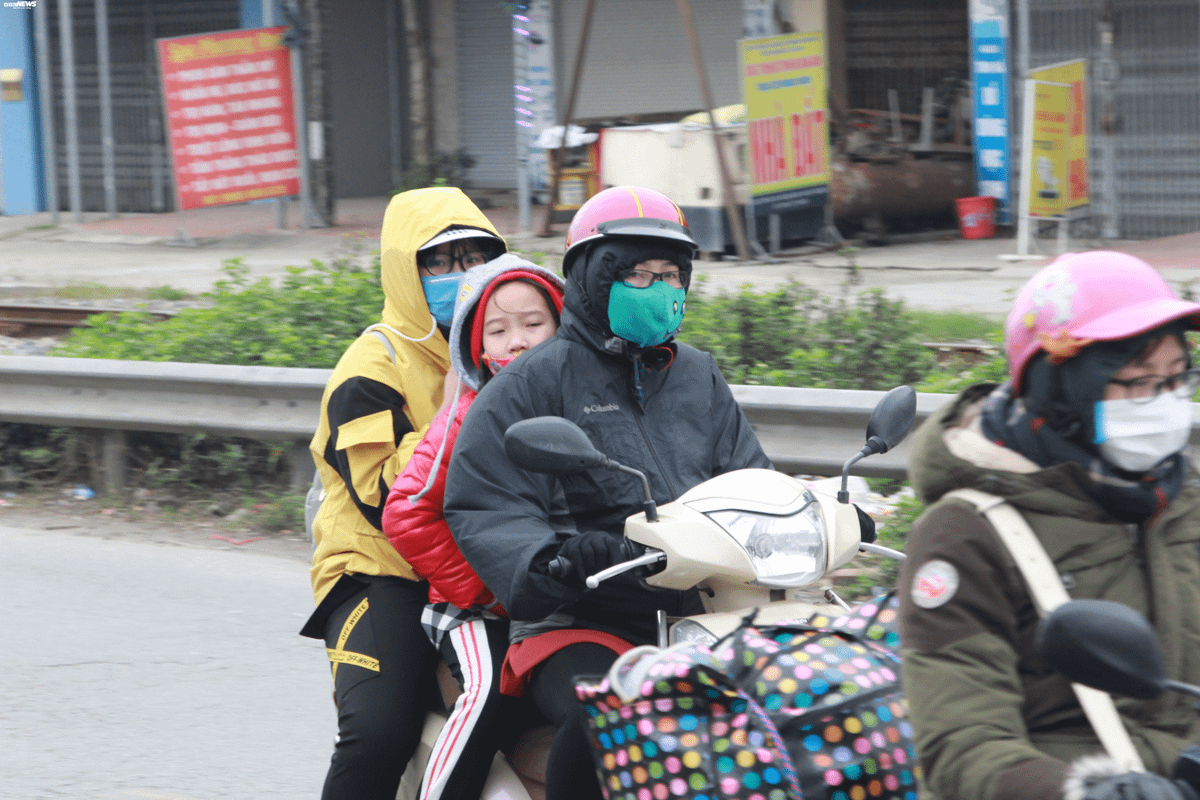 Dù không mưa nhưng nhiều người vẫn mặc áo mưa để tránh cái lạnh thấu da thịt.