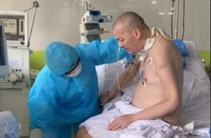 Bệnh nhân phi công người Anh ngồi dậy, đung đưa chân trên giường bệnh