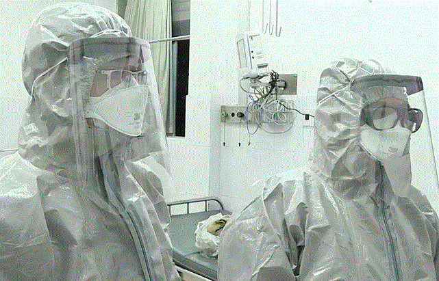 Y bác sĩ trang phục bảo hộ trong phòng điều trị cách ly bệnh nhân nhiễm nCoV tại Bệnh viện Chợ Rẫy. (Ảnh: Đ.H)