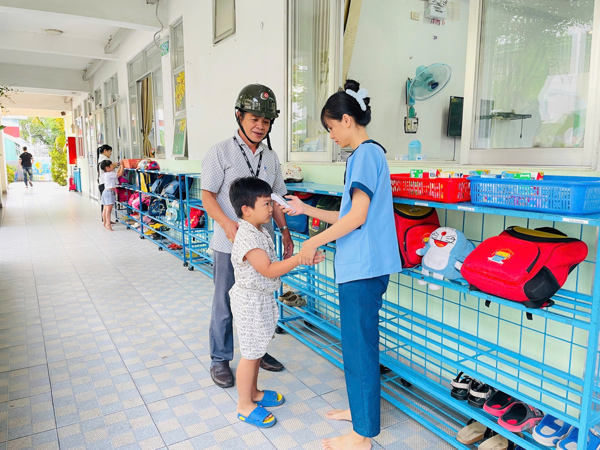 Trường Mầm non Mặt trời nhỏ kiểm tra thân nhiệt trẻ trước khi vào lớp.