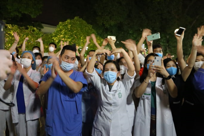 Các cán bộ, nhân viên Bệnh viện Bạch Mai vui mừng trước khoảnh khắc lịch sử.