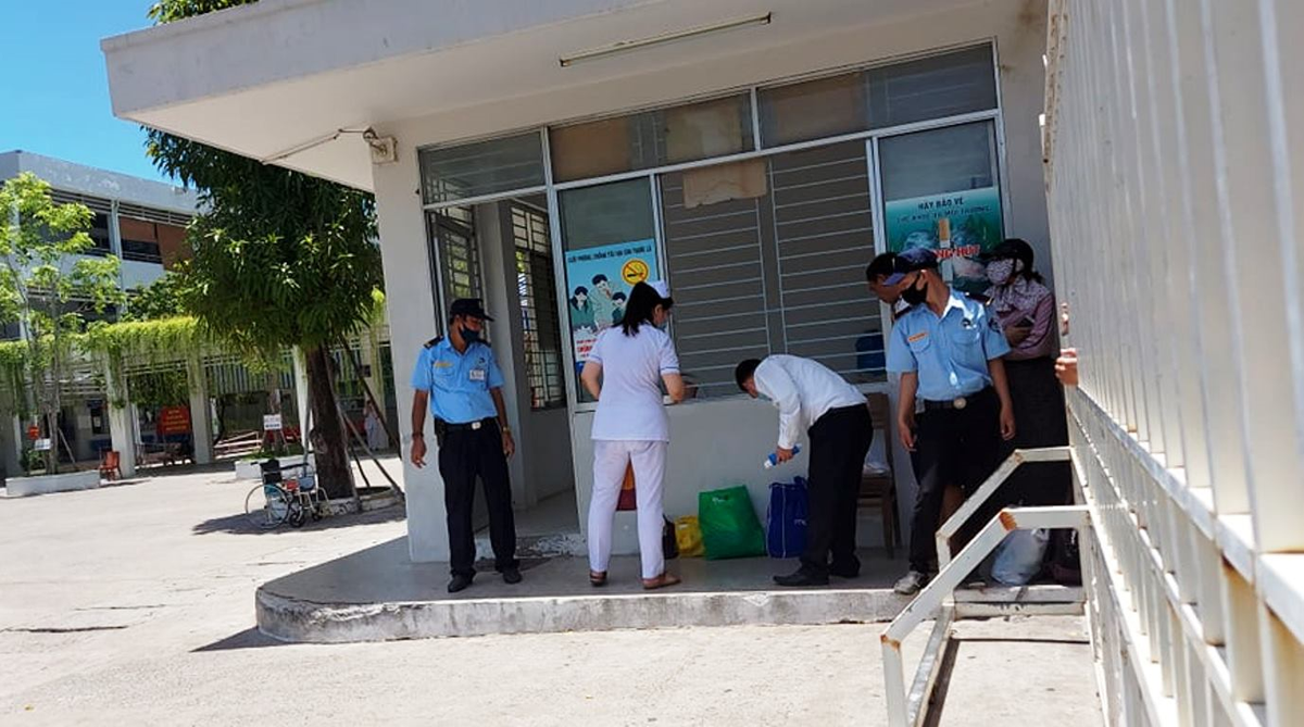 Lực lượng bảo vệ và nhân viên y tế Bệnh viện C tiếp nhận nhu yếu phẩm của người nhà bệnh nhân gửi vào.