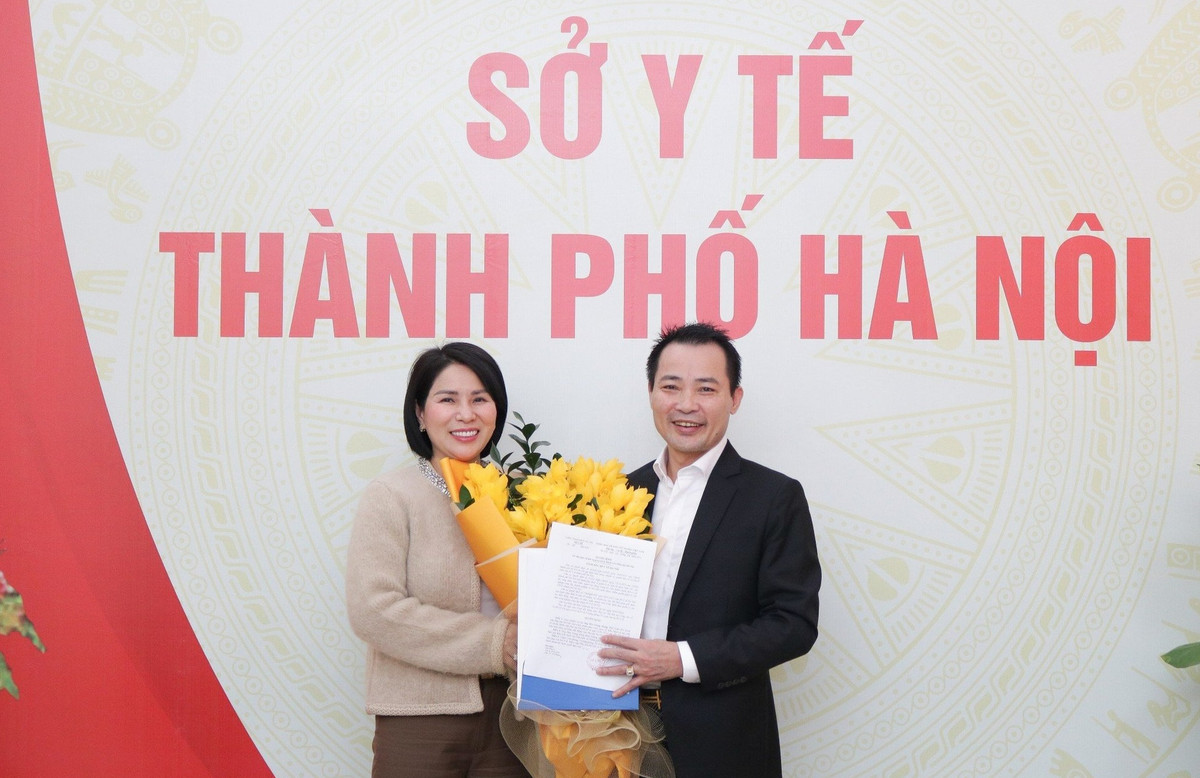 TS. BS. Trần Thị Nhị Hà - Giám đốc Sở Y tế Hà Nội tặng hoa và giao nhiệm vụ mới cho TS. BSCKII. Mai Trọng Hưng.