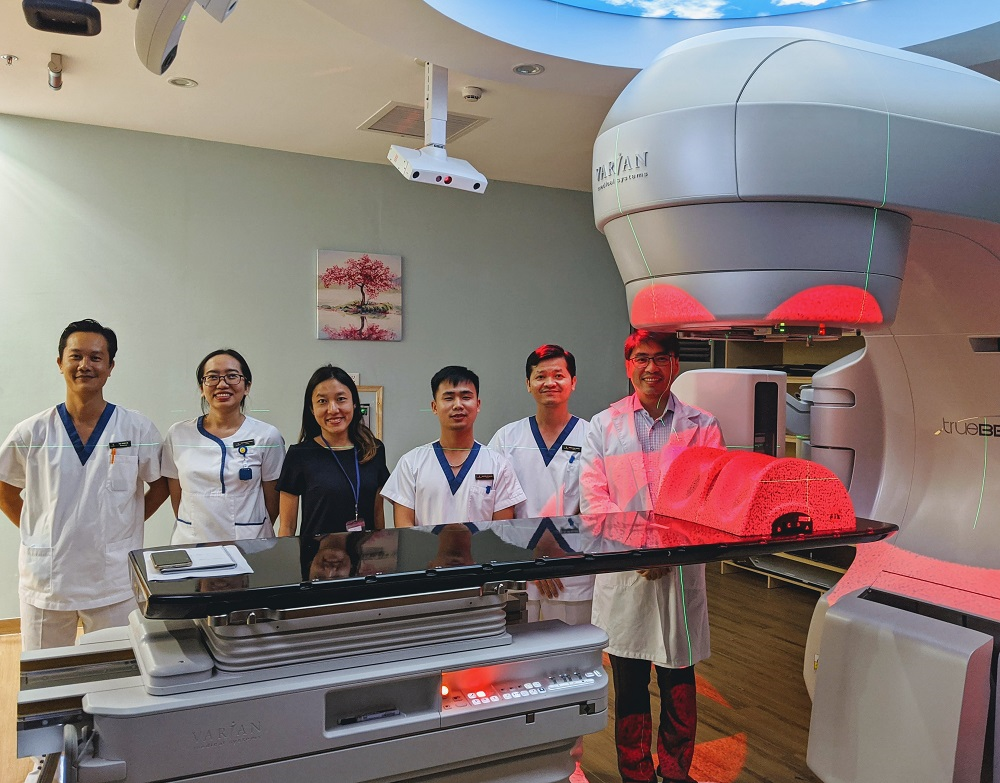 Kíp xạ trị Vinmec Central Park cùng với BS Francis Chin Kuok Choon (ngoài cùng bên phải), chuyên gia của ICON chuẩn bị xạ trị sử dụng OSMS cho người bệnh