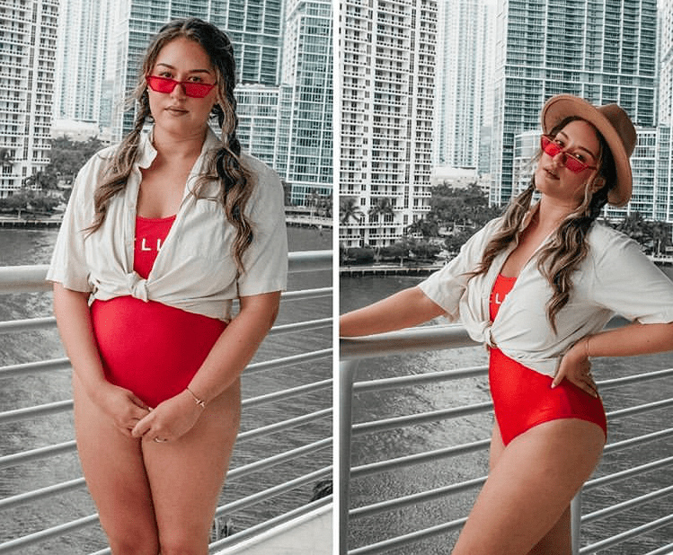Nếu ngại khoe dáng, bạn có thể mặc thêm áo sơmi/ áo phông cùng bộ đồ bơi của mình. Với góc chính diện bao nhiêu mỡ thừa lộ ra hết, nhưng khi nghiêng người, nhón chân, hơi ngả người và đừng quên tay đặt nhẹ lên hông tạo để hiệu ứng eo thon dáng chuẩn.