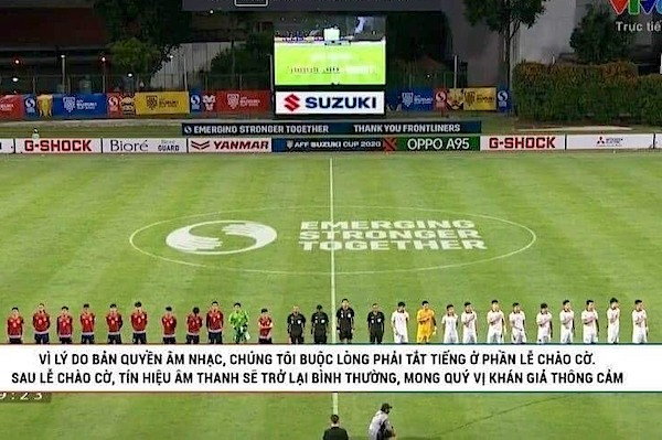 Tối 6/12, trận Việt Nam - Lào tại giải AFF Cup gây xôn xao vì trong phần hát Quốc ca mở đầu trận đấu, khán giả theo dõi trên kênh YouTube không nghe được bài Tiến quân ca. Màn hình trận đấu hiện dòng thông báo: "Vì lý do bản quyền âm nhạc, chúng tôi buộc lòng phải tắt tiếng ở phần lễ chào cờ. Sau lễ chào cờ, tín hiệu âm thanh sẽ trở lại bình thường, mong khán giả thông cảm".