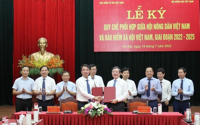 Chủ tịch Hội Nông dân Việt Nam Lương Quốc Đoàn và Tổng Giám đốc Bảo hiểm xã hội Việt Nam Nguyễn Thế Mạnh ký kết quy chế phối hợp giai đoạn 2022-2025. (Ảnh: Đức Quảng)