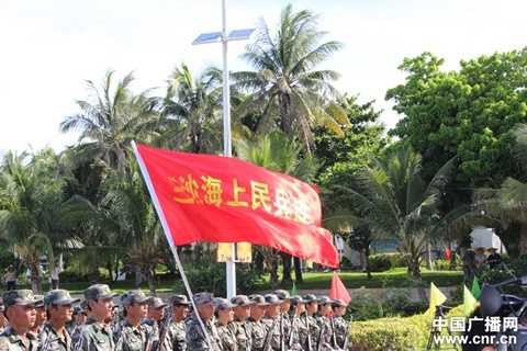 | Dân binh biển ở cái gọi là thành phố Tam Sa, Trung Quốc. Dòng chữ trên lá cờ ghi: dân binh biển Tam Sa |