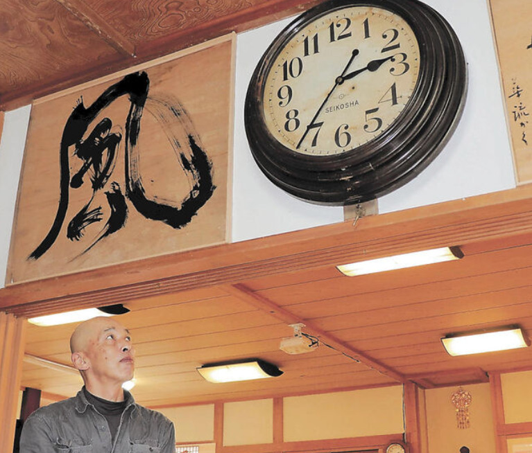 Thầy trụ trì Bunshun Sakano và chiếc đồng hồ cổ ở chùa Fumonji, Yamamoto, Nhật Bản. (Ảnh: Kahoku News)
