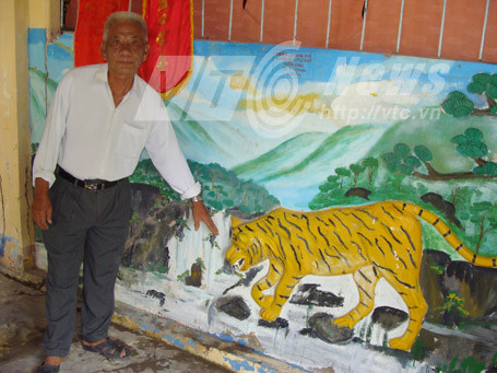 | Ông Hai Thuận bên bức họa ông cọp trong đình |