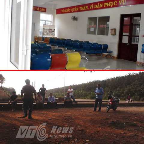 | Bên trong trạm CSGT Suối Tre không một bóng người (trên). Ngược lại bên ngoài trạm, người đứng ngồi la liệt chờ "cò" làm "thủ tục". Ảnh: Phan Cường |