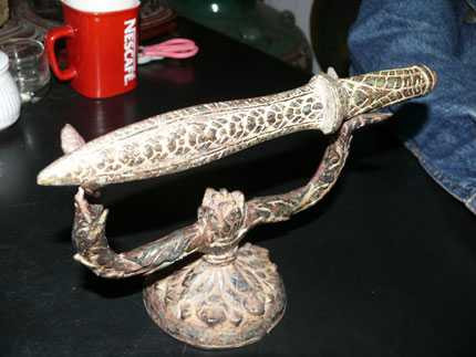 Con dao đặc biệt được ông Thanh gọi là "kiếm lệnh" của vua Chàm. Theo quan sát của chúng tôi, "kiếm lệnh" có 2 phần con dao và chiếc giá đỡ, dao và giá rời nhau.