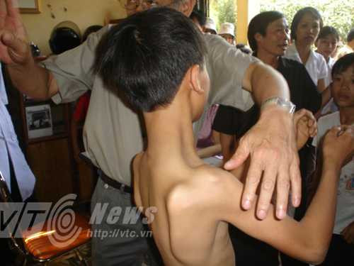 Hỏi chuyện trẻ em trong làng tật nguyền cùng chứng bệnh xơ hóa cơ vai, ông Trọng gọi mấy đứa cháu, đều đã lớn lộc ngộc và bảo: "Chúng nó cũng từng bị teo rút cơ vai cả đấy. Tôi có tổng số 4 đứa cháu, gồm 2 cháu nội và 2 cháu ngoại bị xơ hóa cơ. Cũng may là chúng nó bị đợt sau, khi đó tôi đã cảnh giác rồi, nên phát hiện sớm, mới ở cấp độ 1, nên cho đi phẫu thuật, rồi tập luyện là khỏi".