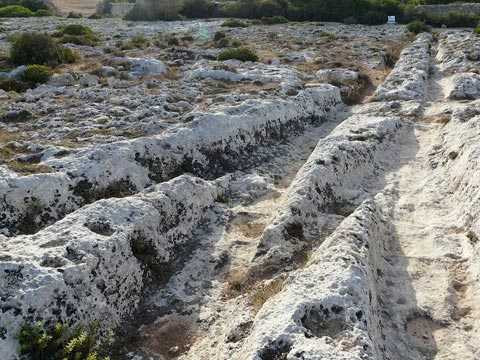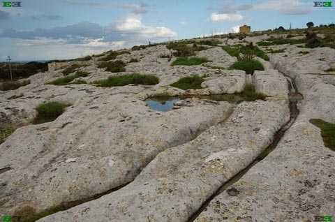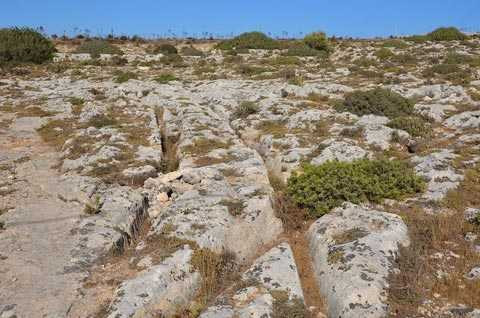 Rải rác khắp nơi là một mạng lưới phức tạp những đường rãnh song song cắt sâu vào bề mặt đá vôi mà dường như do con người tạo ra. Người dân địa phương gọi chúng là "những vết bánh xe" do chúng chẳng khác gì dấu bánh xe để lại.