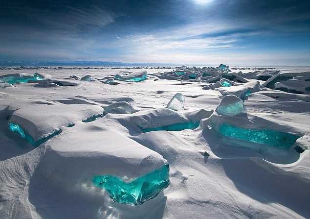 | Khối băng màu xanh tuyệt đẹp trên mặt hồ Baikal |