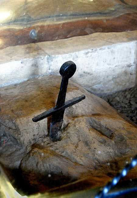Theo truyền thuyết nước Anh, Vua Arthur (Vua Arthur là vị “anh hùng áo vải” của nước Anh thời Trung Cổ, người đã lãnh đạo nhân dân chống lại sự xâm lăng của người Saxon vào đầu thế kỷ thứ 6 để rồi sau đó trở thành vua. Câu chuyện về ông phần lớn được biết đến từ văn học dân gian và truyền thuyết, và việc ông có thực sự tồn tại trong lịch sử hay không hiện vẫn còn gây tranh cãi cho đến tận ngày nay) thuở hàn vi đã dùng tay không rút được thanh gươm thần cắm sâu trong đá núi, điều mà không một người đàn ông nào khác làm được dù họ đã cố hết sức suốt bao năm.