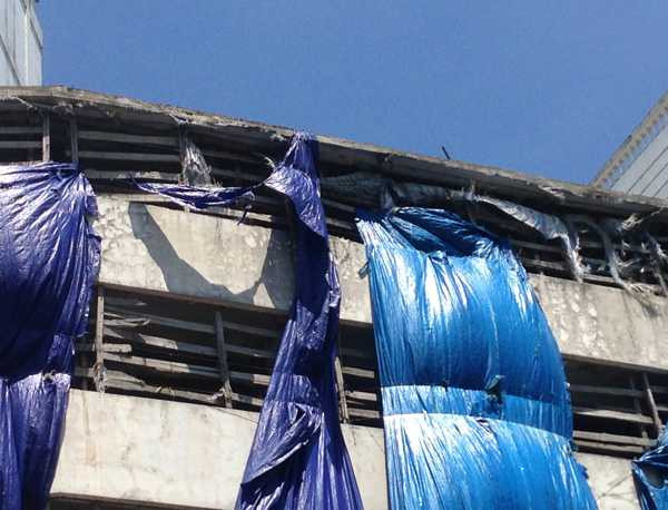 Theo quan sát từ bên ngoài, tòa nhà này đang trong quá trình xây dựng, xong phần thô thì dừng lại, vẫn còn dòng chữ “an toàn lao động” trên công trình. Mặt tiền được che chắn bằng bạt và khung gỗ. Tuy nhiên, theo thời gian, những tấm bạt này đều đã rách rưới tơi tả, gỗ đã ngả màu.