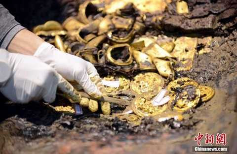(VTC News) - Sau 2.000 năm, những thỏi vàng hình móng ngựa và những đường nét tinh xảo trên quan tài vẫn nguyên vẹn.