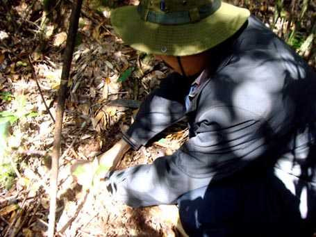 | Lương y Phạm Văn Thanh đang trồng thuốc quý trong rừng |