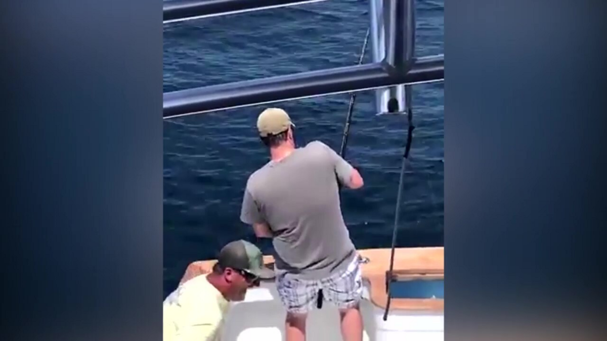 Người đàn ông liên lục kéo cần câu lên nhưng lại không thấy bất kỳ chú cá nào, không biết rằng ông bạn đang bày trò phía sau.