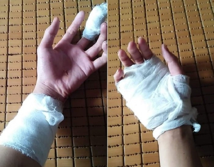 Thầy cô giáo và các bạn sau đó đưa Sơn đến trung tâm y tế để chữa trị. Tại đây, các bác sĩ khâu gần 30 mũi ở bàn tay trái và tay phải của em.
