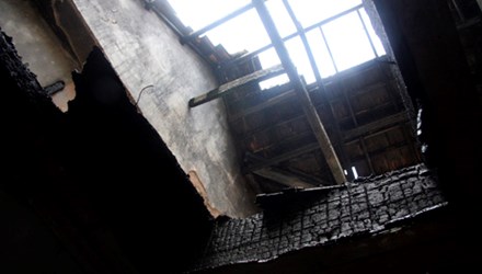 | Căn gác gỗ cháy rụi sau khi người chồng bị vợ tưới xăng đốt. |