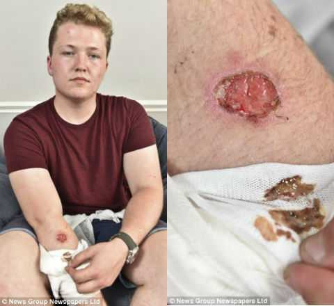 | Jake Parker với vết bỏng trên cánh tay do chiếc iPhone 5 gây ra. Vết thương sau đó cũng bị nhiễm trùng và khiến anh rất đau đớn. |