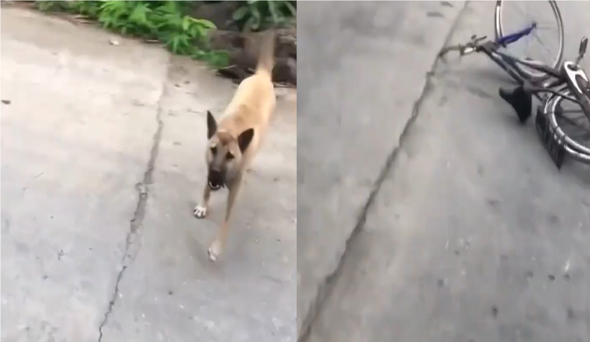 Bị chó đuổi chạy tóe khói, chàng trai vứt xe đạp dọa lại lũ cẩu