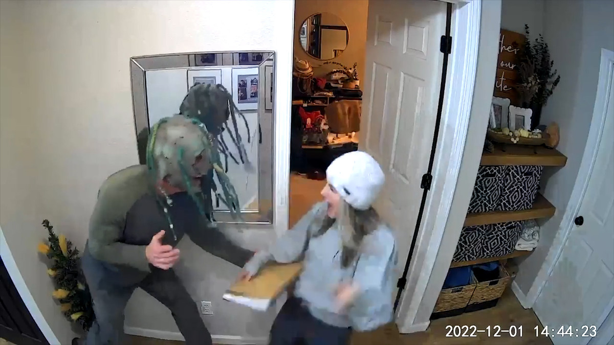 Người phụ nữ ở Alaska, Mỹ cầm búa đi qua cánh cửa liền bị người chồng đeo chiếc mặt nạ “ma quỷ” hù dọa, hoảng hồn người vợ vô tình đập vỡ tấm gương trên tường.