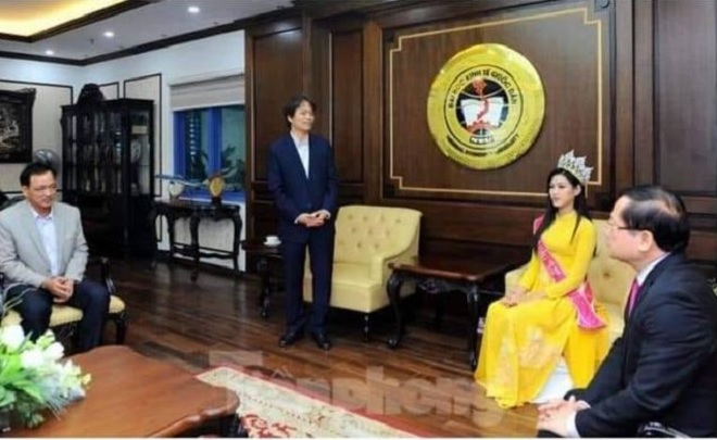 Hôm nay 9/12, mạng xã hội lan truyền bức ảnh chụp trong một phòng tiếp khách của Trường ĐH Kinh tế quốc dân, nơi Hoa hậu Việt Nam Đỗ Thị Hà đang là sinh viên năm thứ hai. Trong đó, Hoa hậu Việt Nam Đỗ Thị Hà đội vương miện, mặc áo dài màu vàng đang ngồi nghiêm trang trên một trong hai ghế chủ tọa.