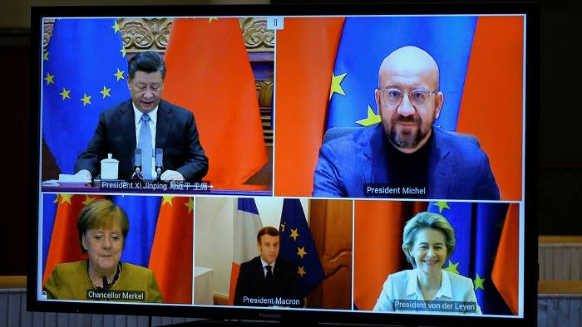 Cuộc họp trực tuyến hồi tháng 12/2020 giữa Chủ tịch Trung Quốc Tập Cận Bình và các nhà lãnh đạo châu Âu về thỏa thuận đầu tư giữa 2 bên. Ảnh: AFP