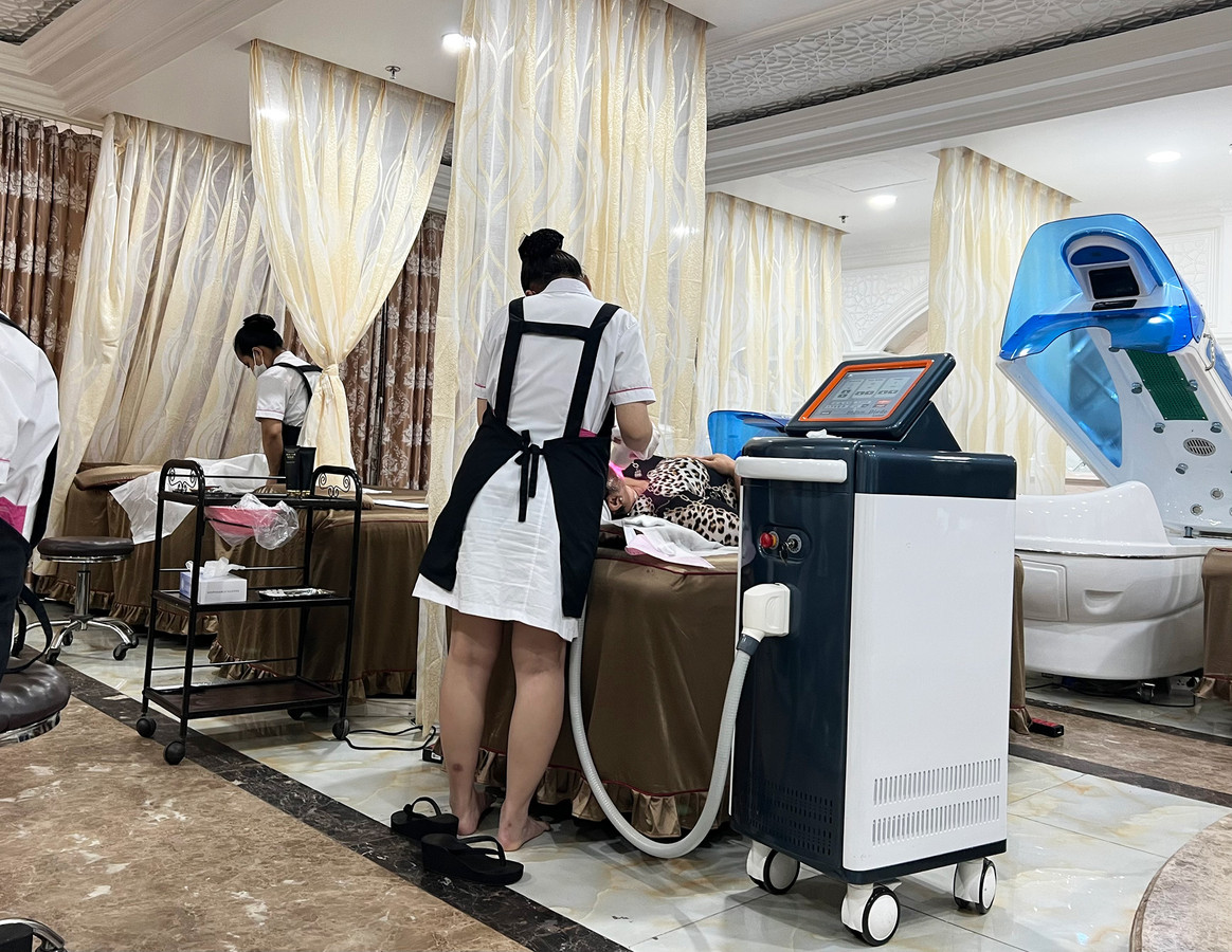 Ghi nhận của PV, lúc 10h30, bên trong căn phòng chăm sóc da tại lầu 6 có 4 nhân viên và 2 khách hàng đang sử dụng dịch vụ.