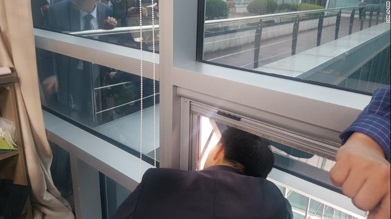 Nghị sỹ Hàn Quốc tổ chức họp báo ngay từ cửa sổ văn phòng. (Ảnh: CNN)