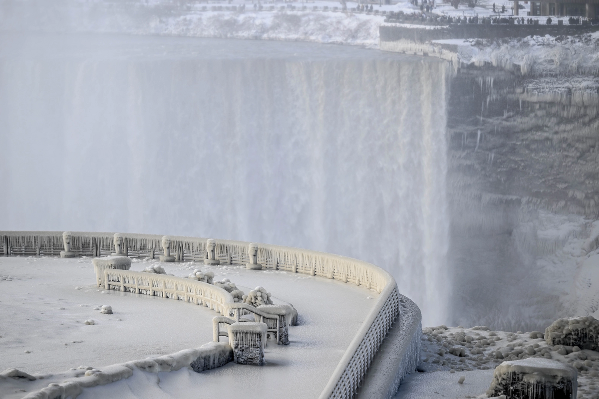Các đài quan sát xung quanh thác Niagara bị bao phủ hoàn toàn bởi băng tuyết.
